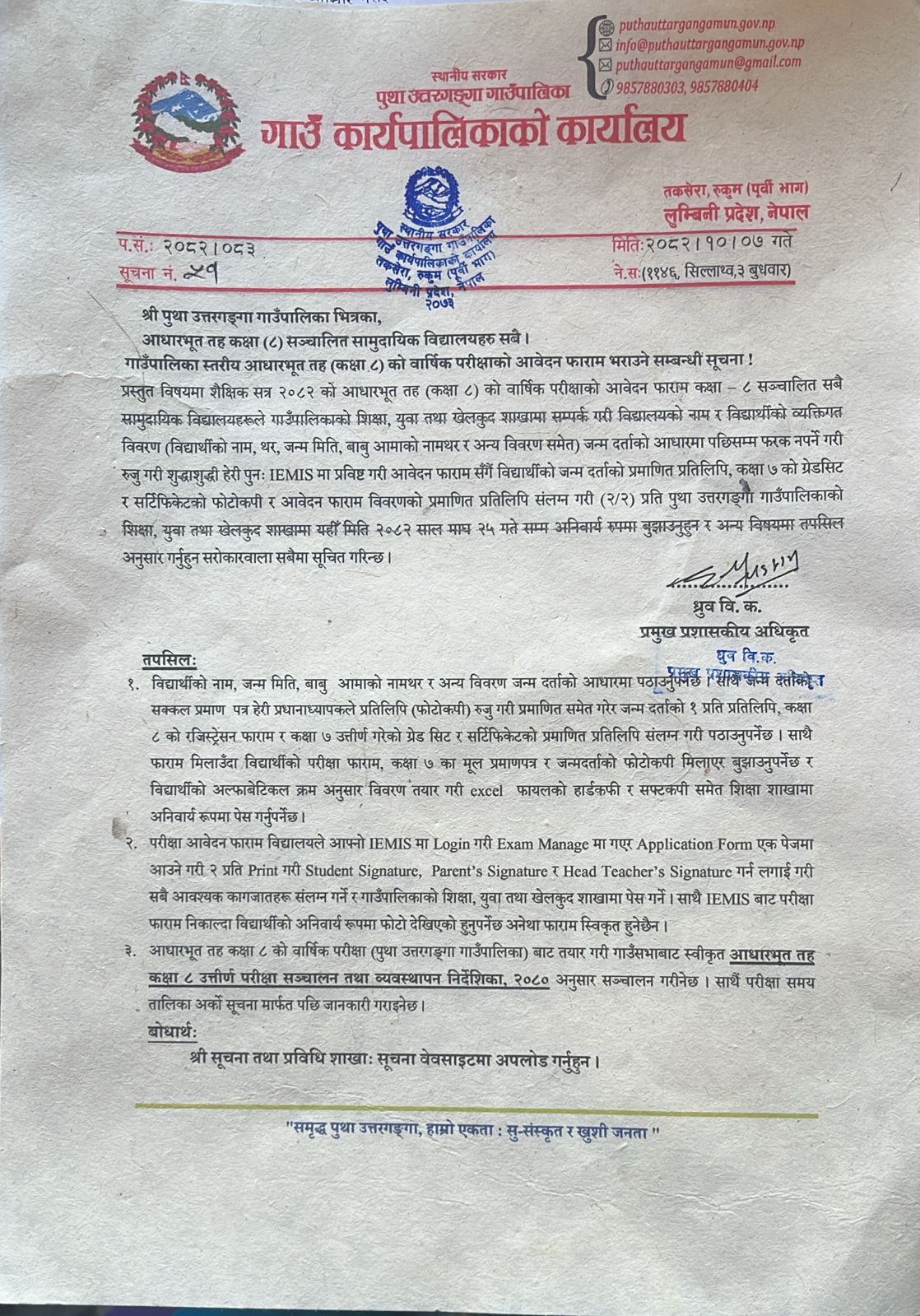 गाउँपालिका स्तरीय आधारभूत तह कक्षा ८ को वार्षिक परीक्षाको आवेदन भराउने सम्बन्धित सूचना ।