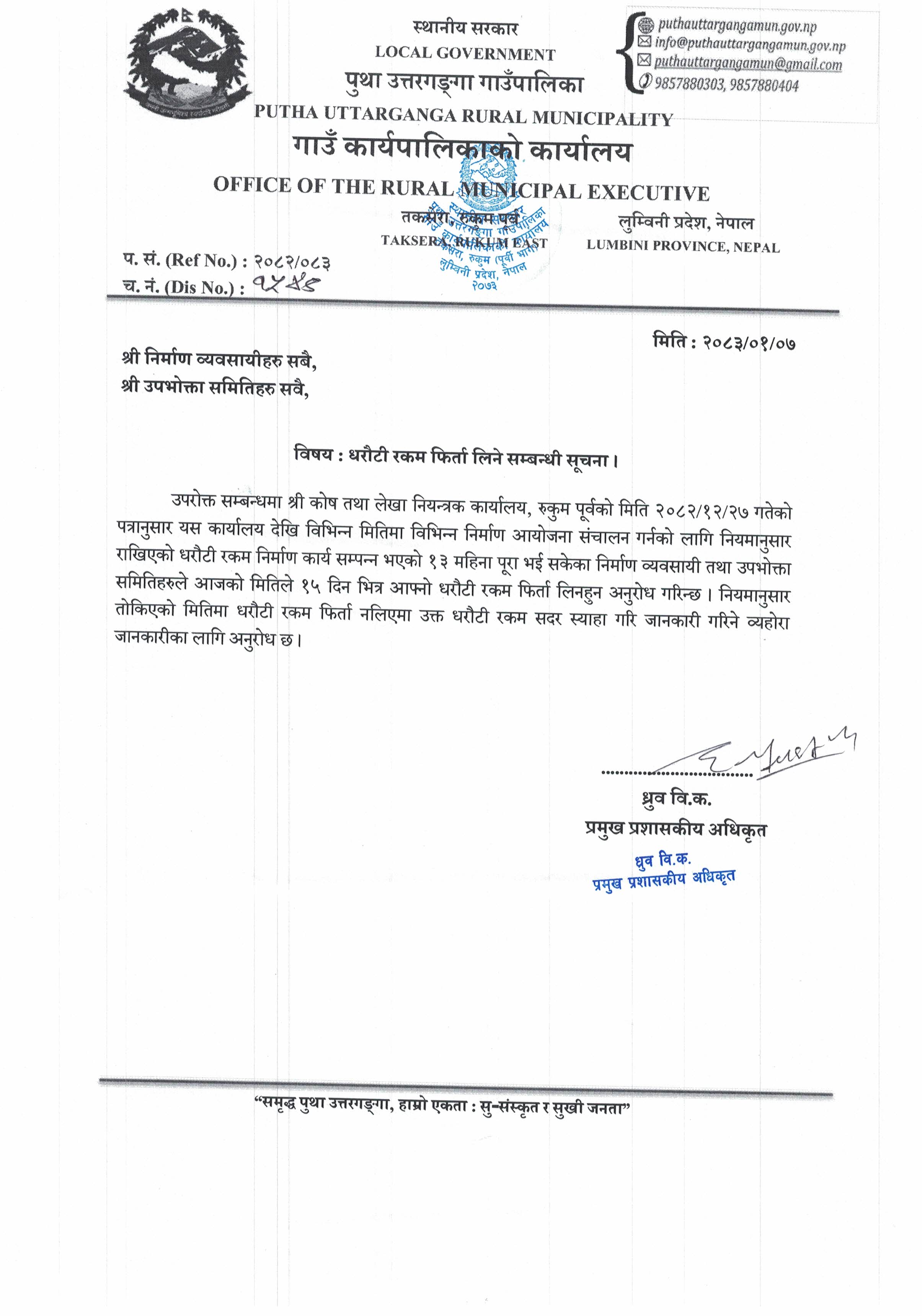 धरौटि रकम फिर्ता लिने सम्बन्धमा । |