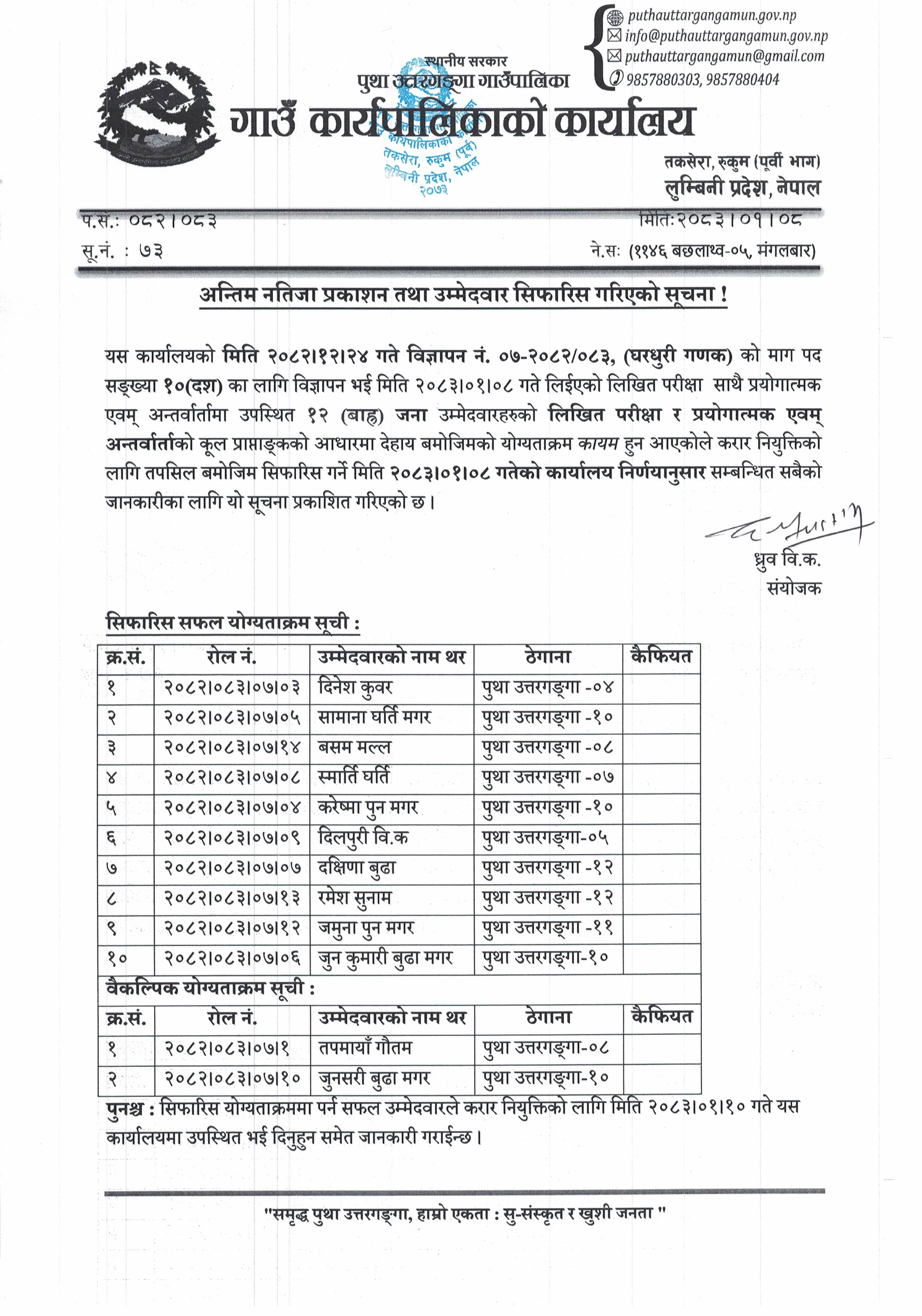अन्तिम नतिजा प्रकाशन तथा उम्मेदवार सिफारिस गरिएको सूचना ! |